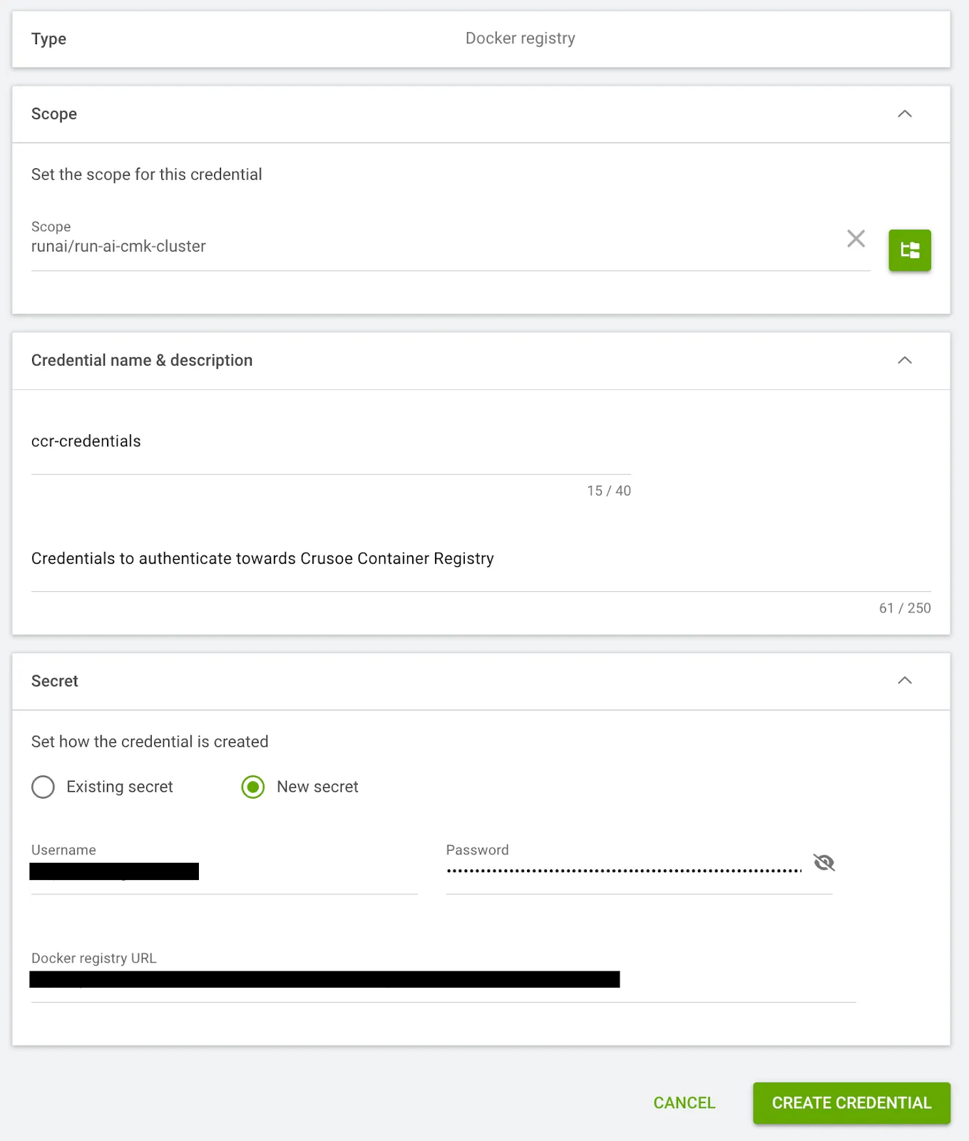 runai-cmk-test-project Active 41s- Create a Credentials object (Secret) in the Run:ai U/I for your container registry (e.g., Crusoe Container Registry) to allow your workloads to pull images. More information about Crusoe Container Registry can be found in the Container Registry.