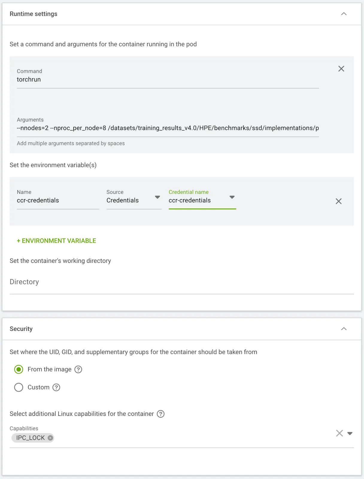 - This configuration launches a distributed training job for an SSD model from mlcommons using the train.py script, running across 16 total processes (8 per node, 1 per GPU). The training is set for 10 epochs with a 0.0001 learning rate and a batch size of 32 per process, resulting in a global batch size of 512. Registry credentials are passed as an Environment Variable, the IPC_LOCK capability is enabled for the containers, and all outputs are written to /datasets/results.