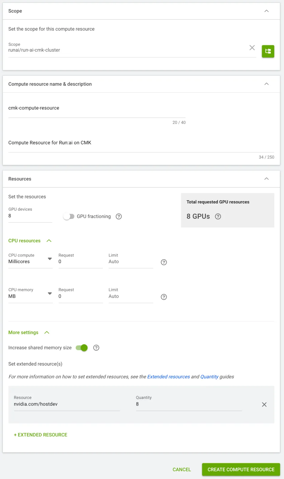 - Set 8 GPUs per device, enable Increase shared memory size and add nvidia.com/hostdev: 8.