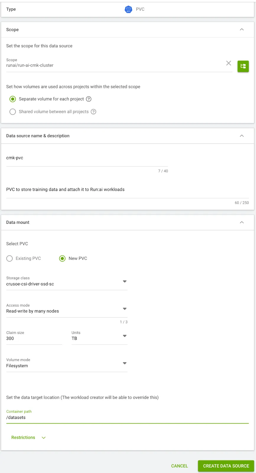 persistentvolumeclaim/cmk-pvc-run-ai-cmk-cluster-kq0h5 Bound mlperf-test-dataset-pv 300Ti RWX crusoe-csi-driver-ssd-sc <unset> 6m43sStep 12: Create a Compute Resource