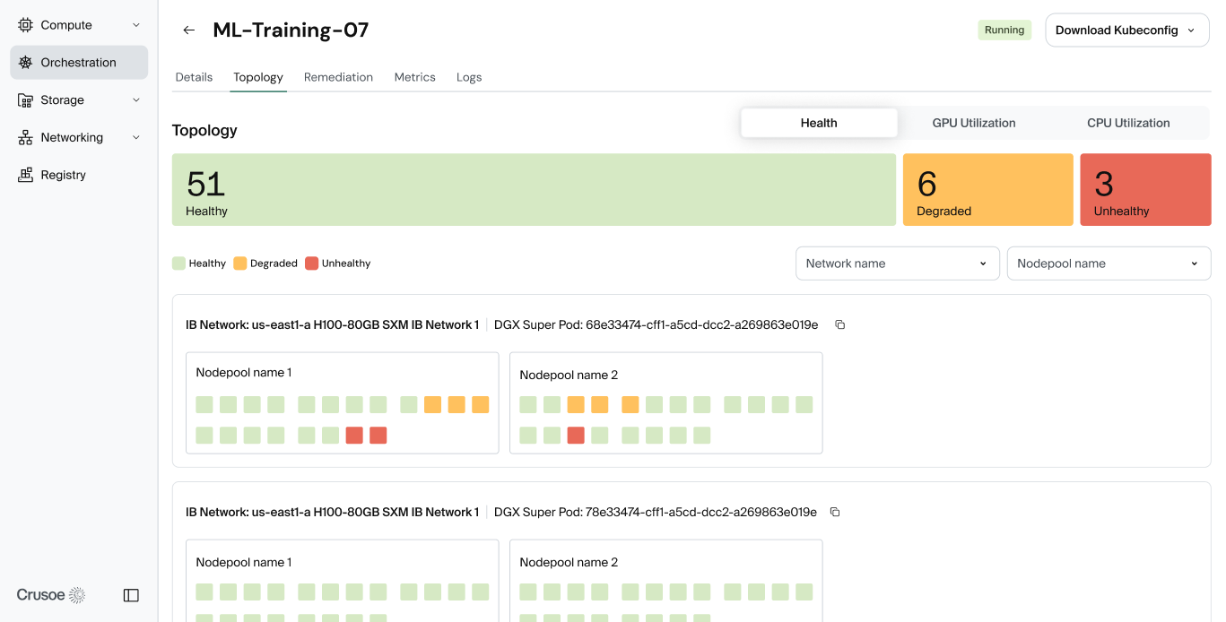 When you’re up and running, Crusoe continuously monitors your system and exposes real-time data in Command Center for full transparency into the health and utilization of your resources.